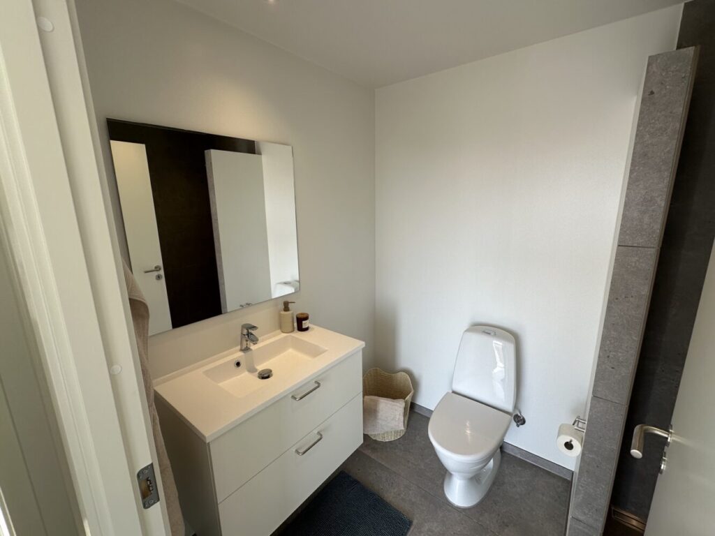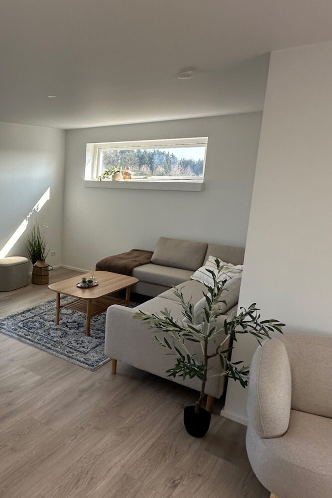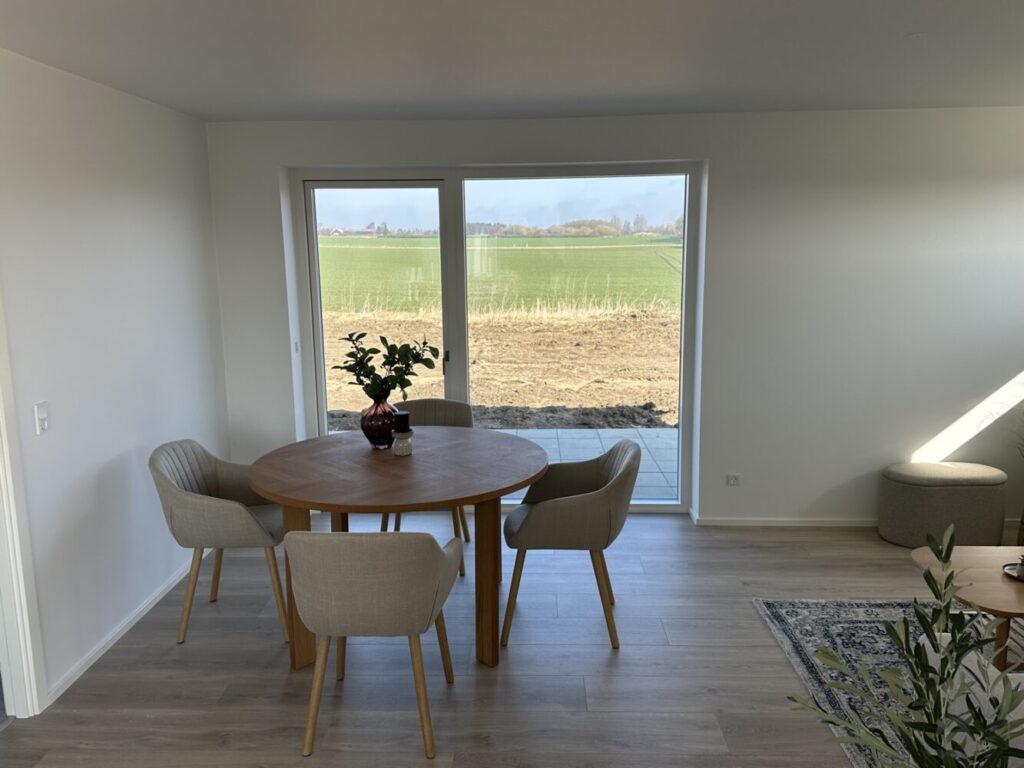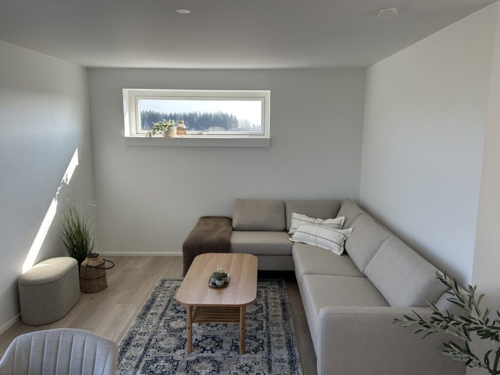 Med denne indretning er der både udsigt til de smukke omgivelser, når du tilbereder mad, underholder gæster – eller bare slapper af i sofaen. Indretningen er yderst funktionel men samtidig er hensynet til udsigten og hjertet i boligen tænkt ind på fineste vis.
